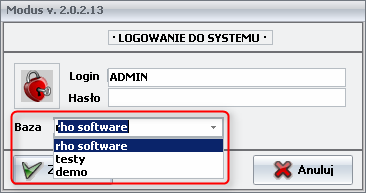 Po uruchomieniu systemu Modus na danym stanowisku, w oknie logowania pojawia się lista rozwijana z bazami danych skonfigurowanymi w panelu administracyjnym [Ekran 1].