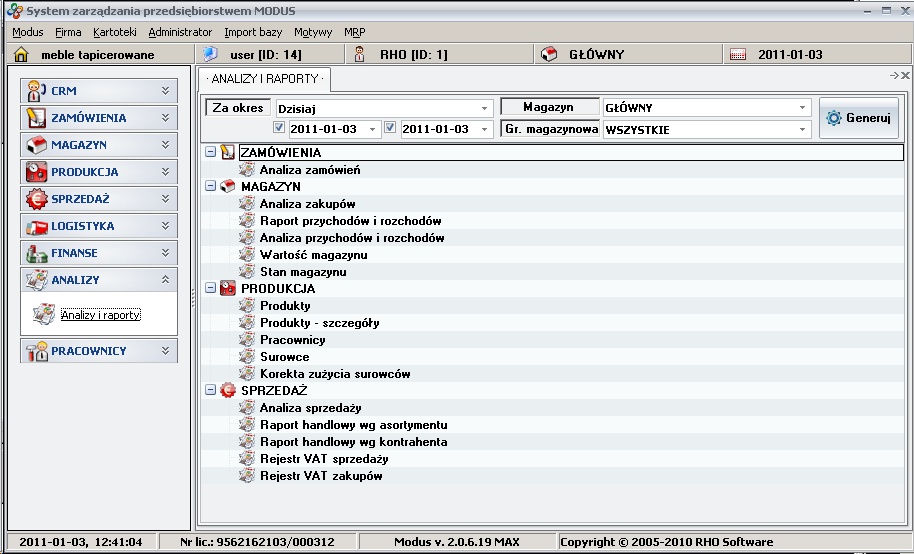Moduł analiz i raportów pozwala na tworzenie analiz i raportów wg podanych kryteriów. Filtr pozwala określić za jaki okres ma być raport lub analiza, którego magazynu dotyczy oraz jakiej grupy magazynowej.