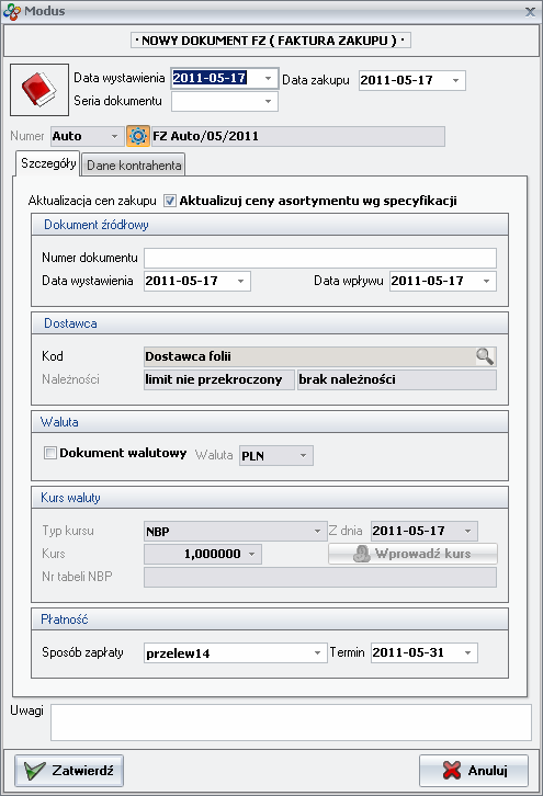 - Submit document header FZK - if in the (Files / Configuration / Documents) system correction invoices are enabled and unique document required in terms of counterparty program can inform the field of foreign document must have a unique value. The message will be displayed, eg due to previously carried out adjustment of the amount for which the PZ document was generated automatically correcting invoice. After adding at least some symbol a document will be approved.