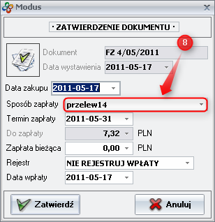 - Choose metod of payment. Depending on the type of fiscal transaction document is settled (cash transactions) or goes to the Finance - Accounts module (credit transactions).