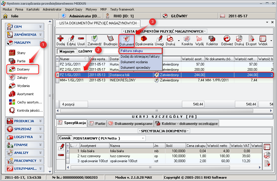 - Purchase invoice can be automaticly generated on the bases of existing PZ document and edited.