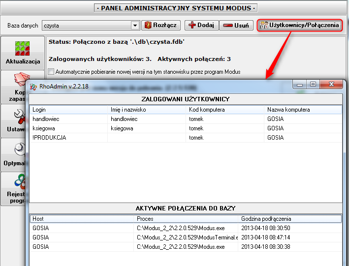Jeśli do bazy zalogowani są użytkownicy lub są jakieś połączenia do bazy danych nie należy rozpoczynać aktualizacji. Należy sprawdzić którzy użytkownicy są zalogowani oraz na których stanowiskach są aktywne połączenia do bazy danych. Ma to celu poinformowania użytkowników o konieczności zakończenia procy. Informacji na temat użytkowników zalogowanych i aktywnych połączeń dostarcza funkcja Użytkownicy/połączenia