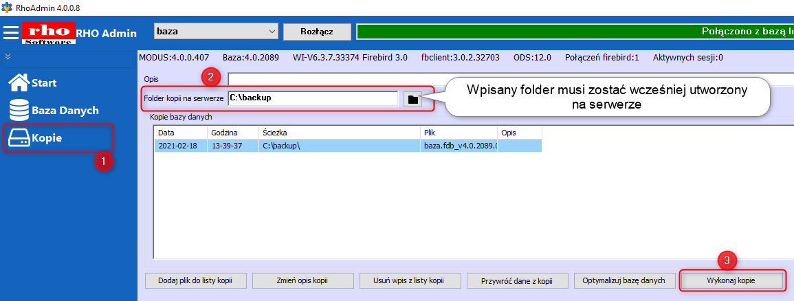 Począwszy od wersji 2.2.11 RhoAdmina kopie zapasowe wykonywane się tylko i wyłącznie po stronie serwera Firebird. Dzięki takiemu rozwiązaniu: