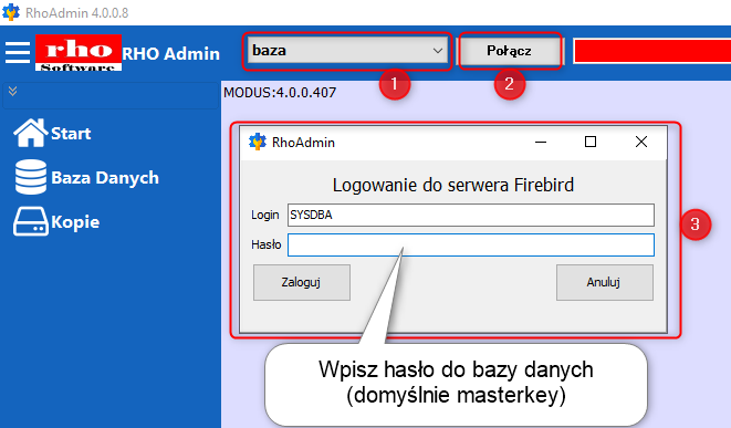 Domyślnym użytkownikiem serwera Firebird jest SYSDBA, a jego hasłem masterkey (uwaga na duże i małe litery). Jeżeli hasło nie było zmieniane, to do utworzenie kopii bazy Modusa należy uruchomić polecenie: