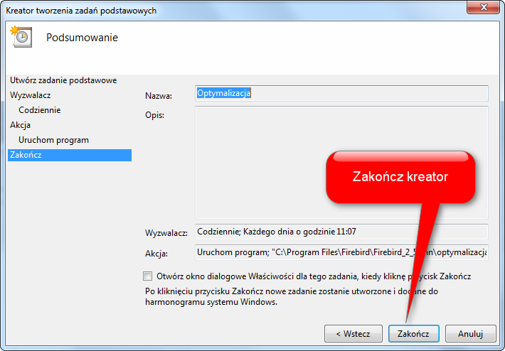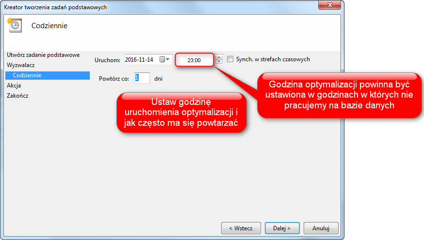 Proces optymalizacji składa się z dwóch etapów. Pierwszy to utworzenie kopii bazy danych, a drugi to przywrócenie danych z kopii do bazy danych. Z tego powodu konieczne są do przeprowadzenia dwa zadania w harmonogramie zadań.