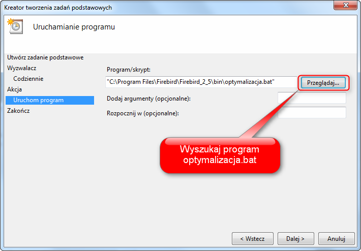 Aby wykonać optymalizację bazy danych systemu, należy uruchomić program gbak.exe o ustalonej przez nas porze dnia. Program gbak domyślnie znajduje sie w katalogu