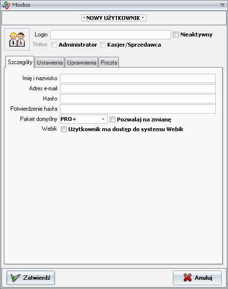 W konfiguracji systemu Modus każdemu pracownikowi który ma posiadać dostęp do systemu należy założyć konto użytkownika z indywidualnym loginem i hasłem. Założenie konta użytkownika następuje poprzez założenie jego karty na której można zdefiniować jego ustawienia dotyczące np magazynu startowego, domyślnego okresu wyświetlania dokumentów oraz uprawnienia do poszczególnych modułów i funkcji.