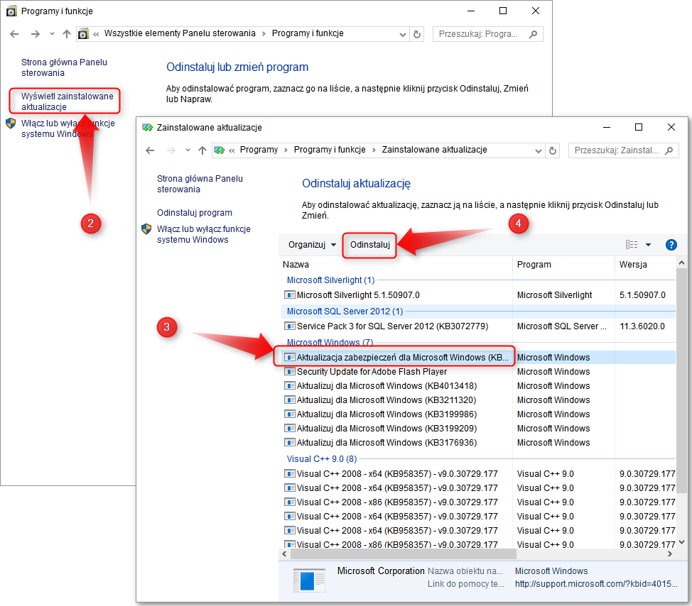 - Z lewej strony okna wybrać Wyświetl zainstalowane aktualizacje (Ekran 2)