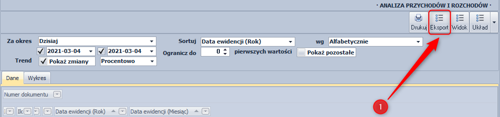 Analiza ta pozwala na sprawdzenie wartości dokumentów przychodowych i rozchodowych w zadanym okresie. Domyślnie zestawianie to ma układ podobny do raportu przychodów i rozchodów. Jednak dzięki formie tabeli przestawnej, analiza może zostać zmieniona lub rozbudowana.