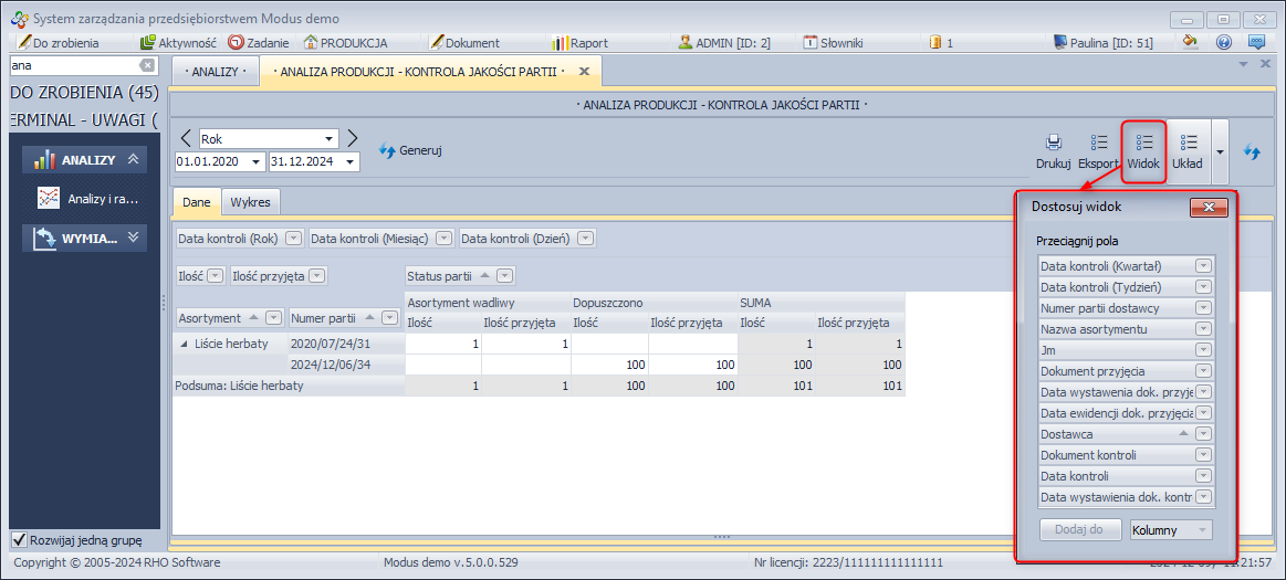 - W module Analizy i raporty