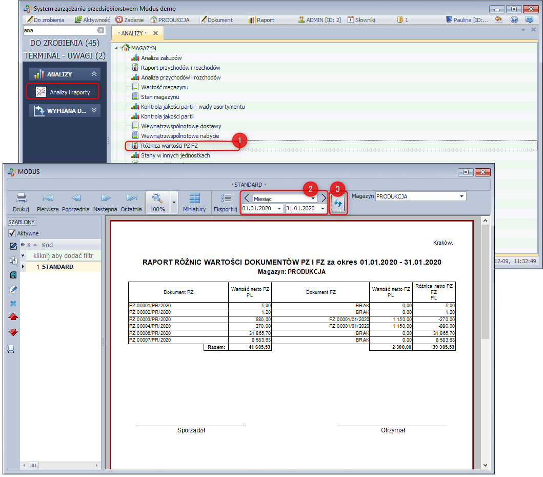 Aby wygenerować raport róznic między dokumentami PZ, a fakturami zakupów w wybranym okresie: