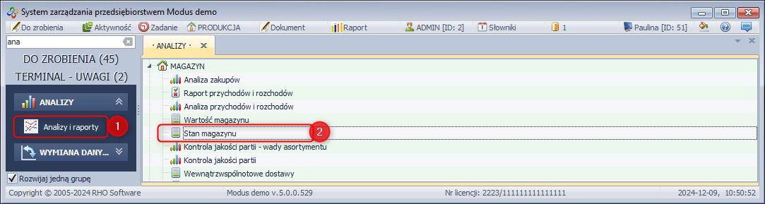 - Z menu ANALIZY wybierz Analizy i raporty.