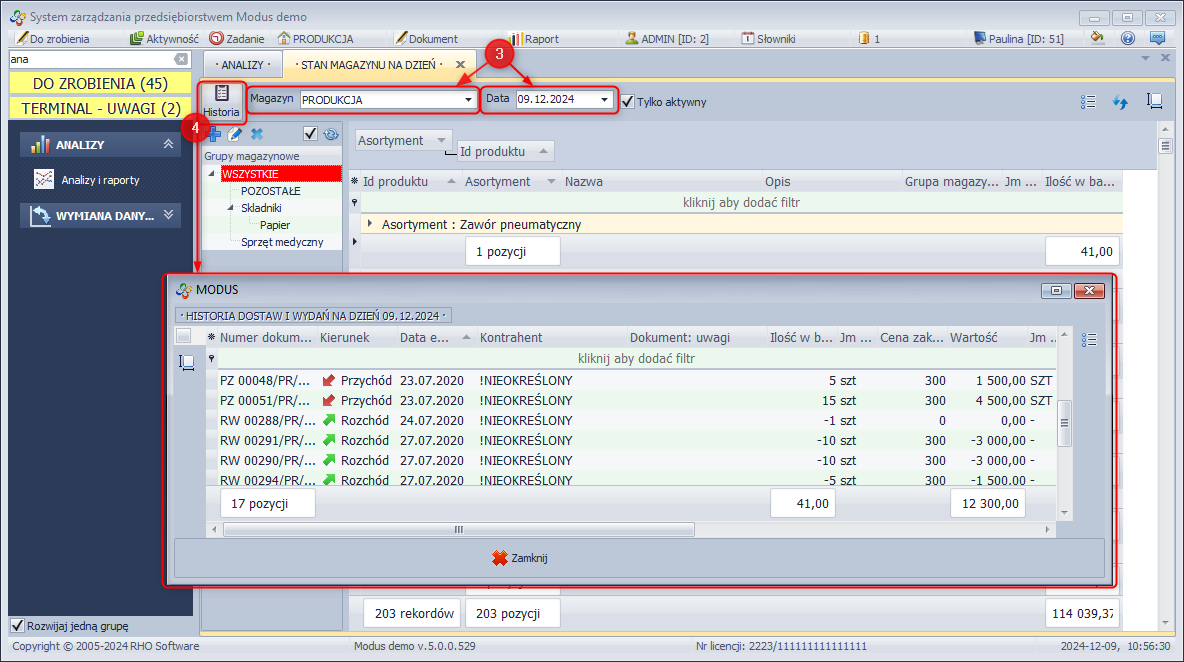 | Lista dokumentów (LOGISTYKA → Przyjęcia/Wydania) | Analiza przychodów i rozchodów | ||