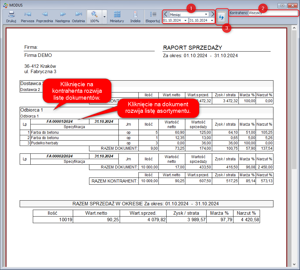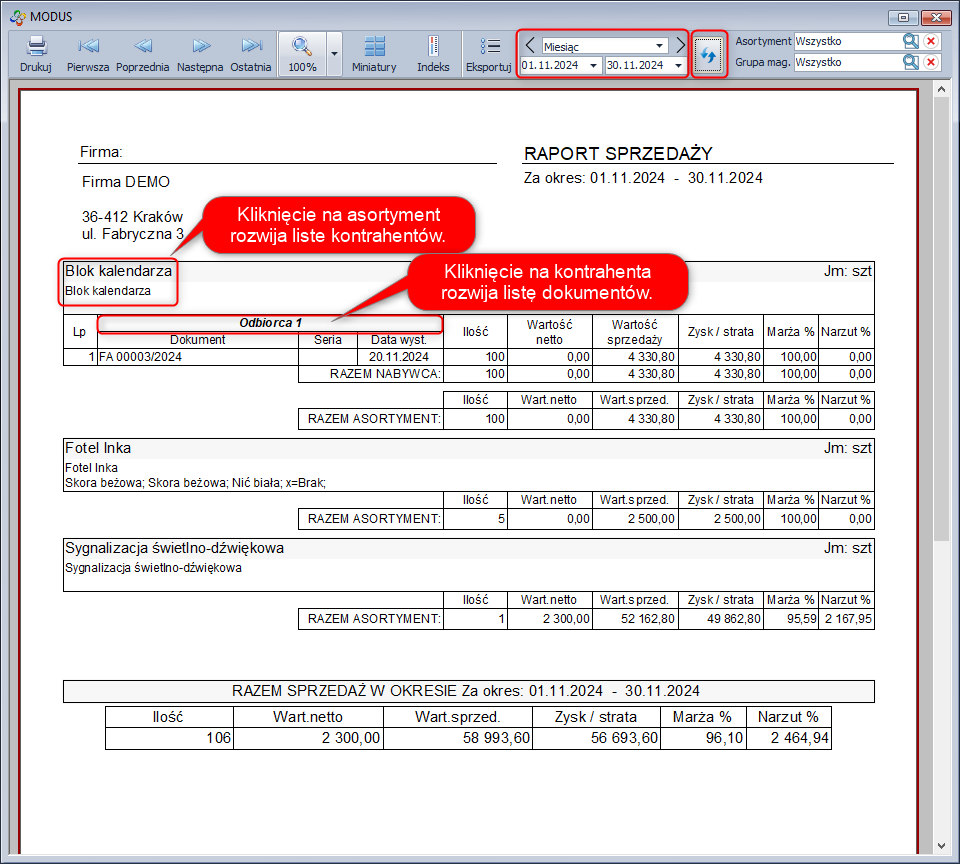 Przygotowuje gotowy do wydruku raport sprzedaży dla wszystkich bądź wybranych kontrahentów w zadanym okresie czasu. Aby uzyskać więcej szczegółowych informacji na wydruku mamy możliwość rozwinięcia raportu o dokumenty i asortyment sprzedany danemu kontrahentowi.