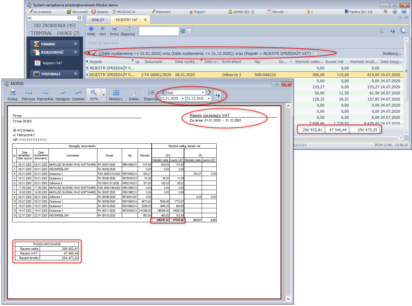 Analiza przygotowuje raport dokumentów sprzedaży zaksięgowanych w rejestrach VAT