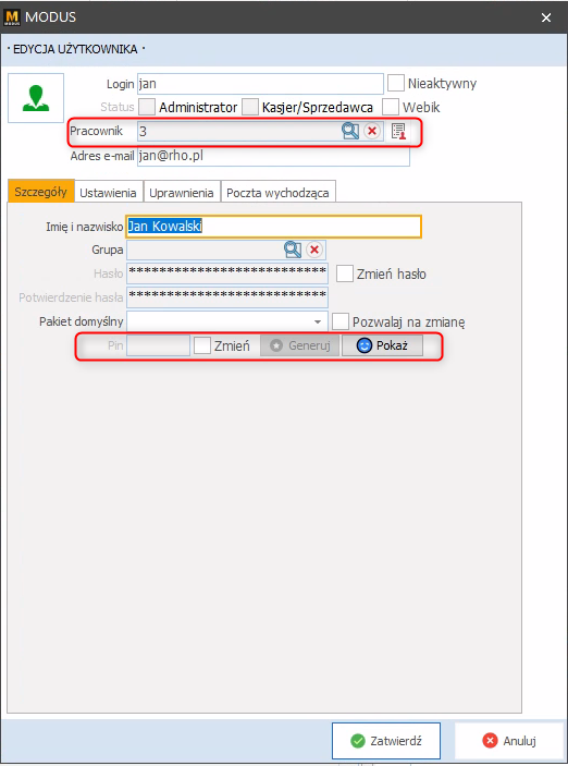 - Otwórz kartotekę użytkownika, którego chcesz skonfigurować. Wprowadź wymagane dane użytkownika, takie jak login, status (np. Administrator, Kasjer/Sprzedawca) oraz adres e-mail.