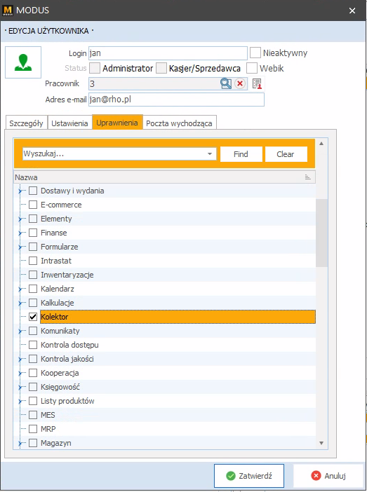 Aby korzystać z aplikacji Kolektor, należy skonfigurować użytkownika w systemie Modus ERP poprzez kartotekę użytkownika.
