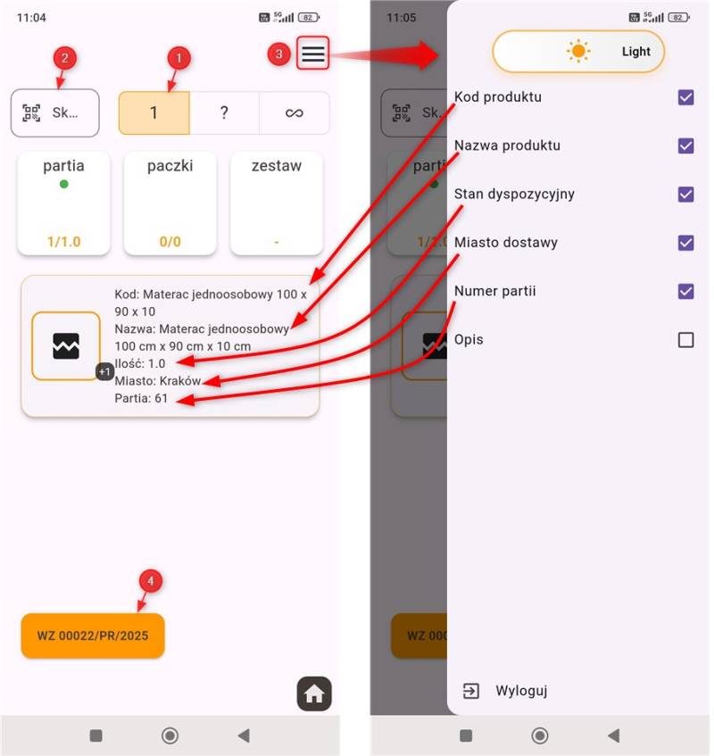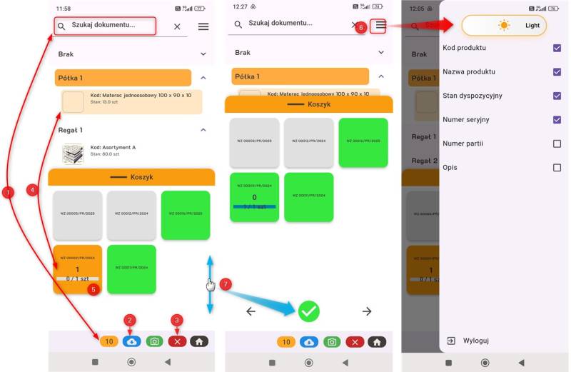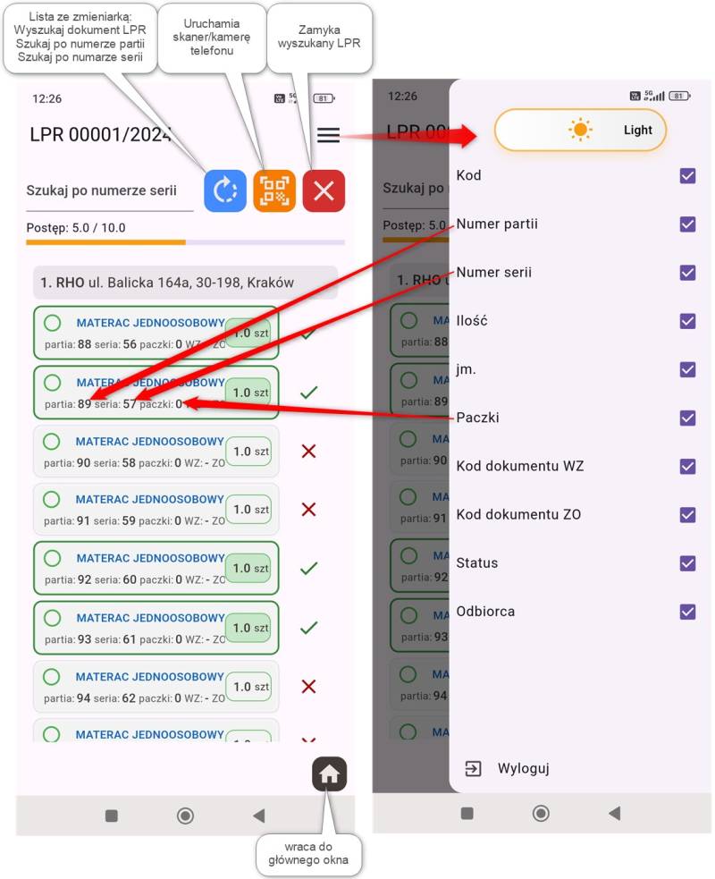 Weryfikacji można dokonywać skanując urządzeniem towar (po numerze serii lub partii), lub wpisując numery ręcznie - czy też odznaczając X/V bezpośrednio na liście.