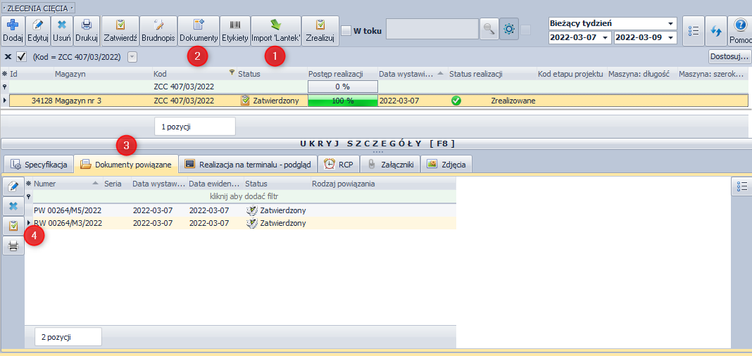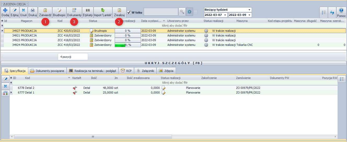 Moduł Cięcie - Detale pozwala na realizację zleceń cięcia zadeklarowanych wcześniej detali.