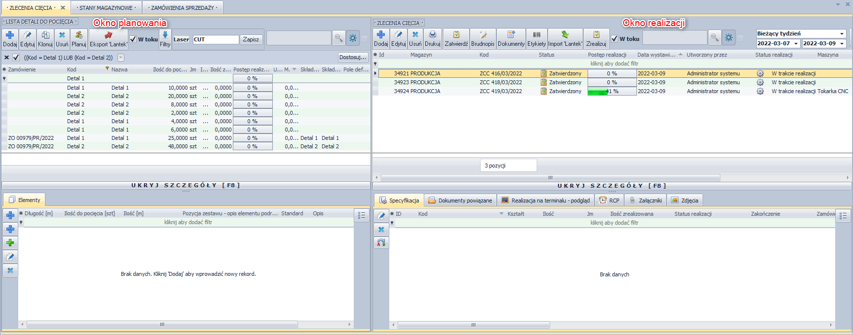 Moduł ten składa się z dwóch okien, po lewej stronie widnieje widok detali planowanych do cięcia, natomiast po prawej stronie znajduje się okno realizacji poszczególnych detali.