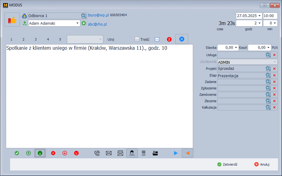 - typu aktywności (telefon, e-mail, spotkanie itp.),