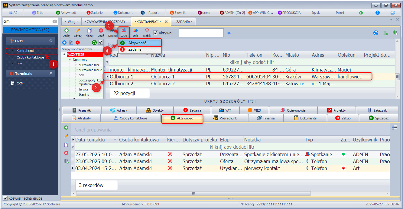 - Wybierz kontrahenta, do którego chcesz odnotować aktywność.