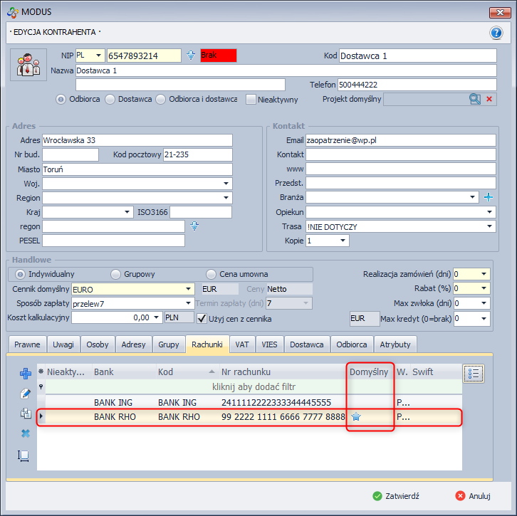 Dane Kontrahenta zdefiniowanego jako domyślny są wykorzystywane przy generowaniu zamówienia do dostawcy z poziomu modułu Produkcja - Zapotrzebowanie.