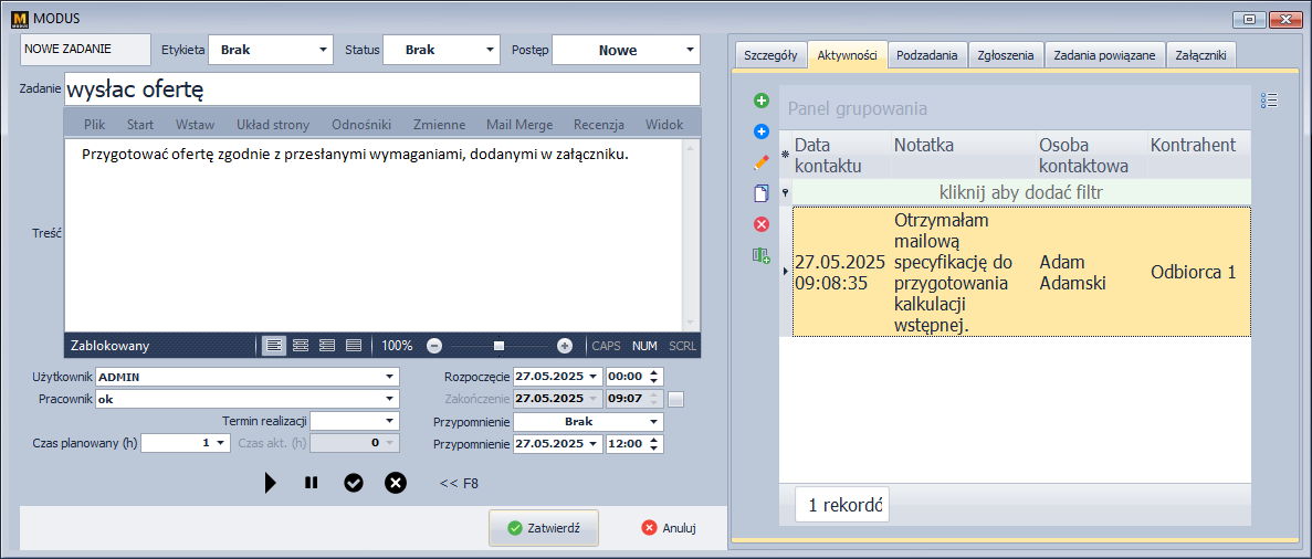 - Wybierz kontrahenta, z którym związane ma być dodawane zadanie.