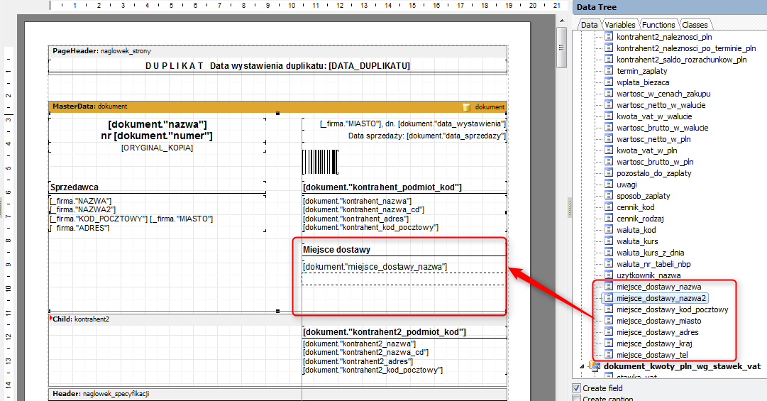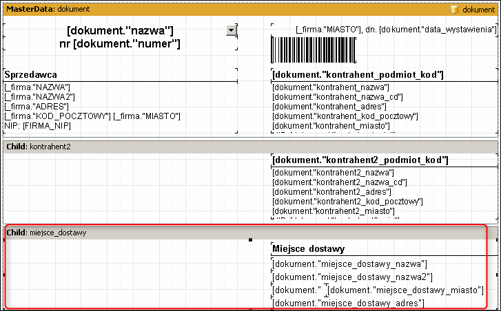 Dodatkowy kontrahent automatycznie jest wyświetlany na wydruku dokumentu, natomiast zastosowanie adresu dostawy wymaga edycji szablonu wydruku i umieszczenia na nim obiektu adres dostawy [dokument.„miejsce_dostawy_nazwa”].