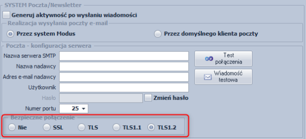 Aby dokonać zmiany szyfrowania TLS należy przejść do modułu System → Ustawienia globalne następnie w zakładce Poczta należy określić sposób szyfrowania. Ekran: Ustawienia szyfrowania