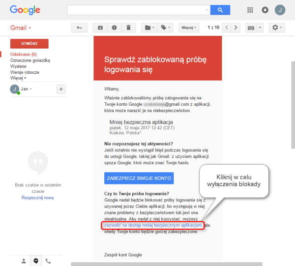 Ekran: Wyłączenie blokady połączenia Modus z pocztą Gmail