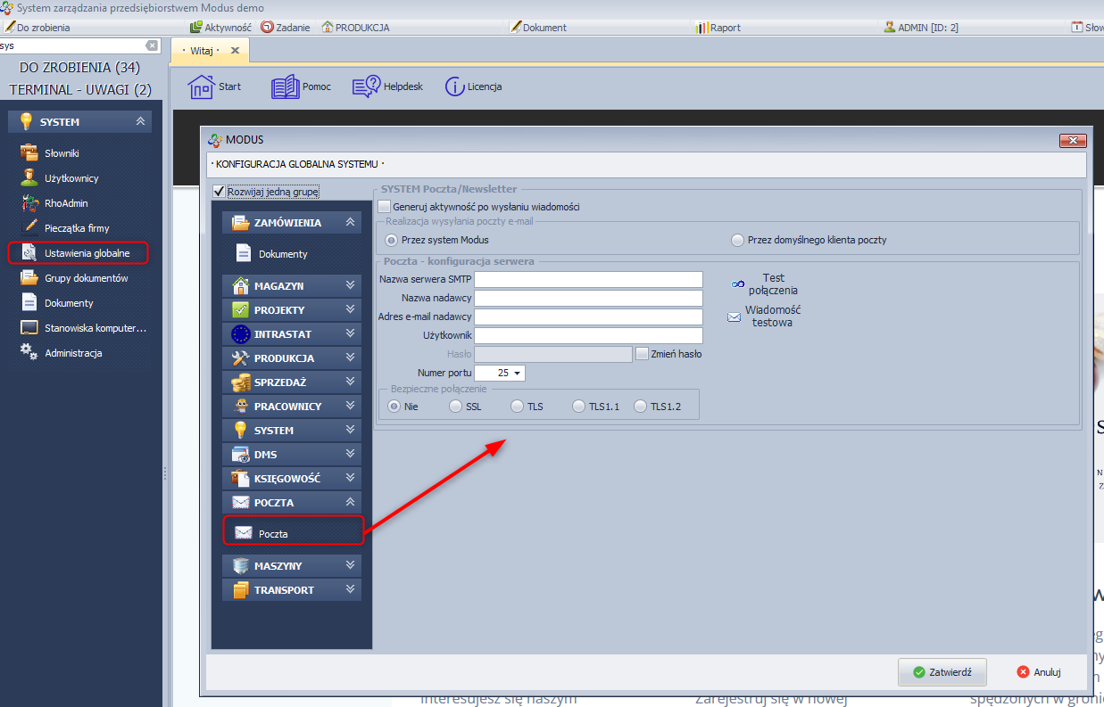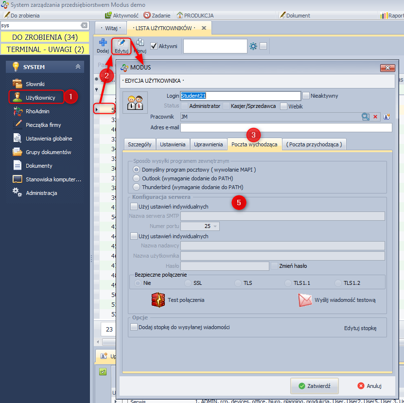 Każdy z użytkowników systemu ma możliwość indywidualnego ustawienia poczty wychodzącej w systemie Modus.