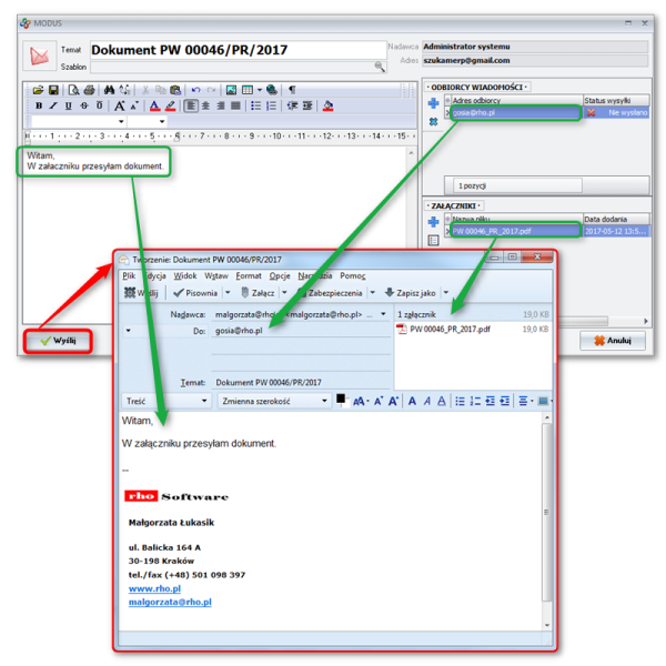- wartość pola Odbiorca zostanie uzupełniona adresem mailowym kontrahenta (o ile był wprowadzony w Modusie)