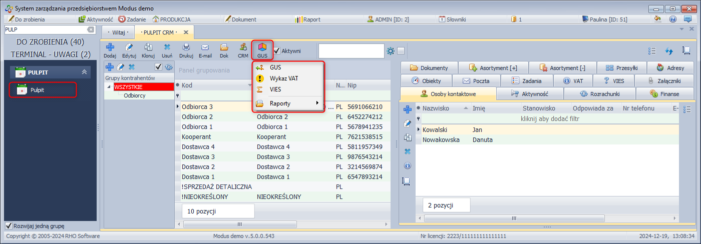 W oknie głównym modułu Pulpit znajduje się pełna lista kontrahentów, wraz z dodatkowymi informacjami o nich takimi jak: wystawione dokumenty, osoby kontaktowe czy rozrachunki.