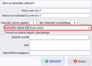 2. W module Słowniki edycja sposobu zapłaty i przypisanie domyślnego rejestru kasowo-bankowego