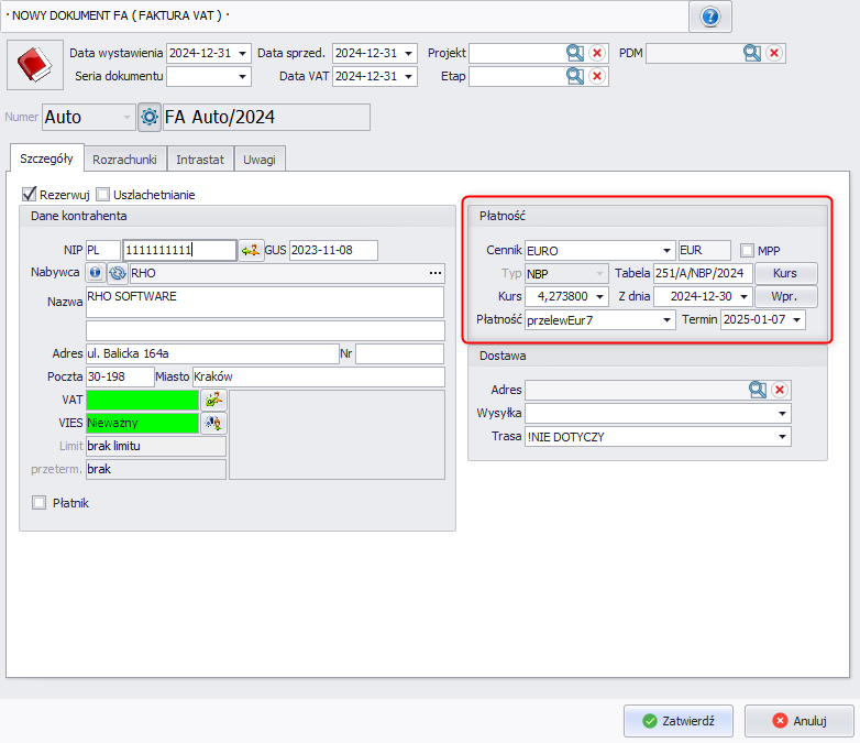 - Użytkownika wystawiającego (definiowany w kartotece użytkownika).