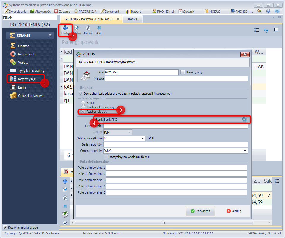 Zdefiniowanie rejestru dla rachunku VAT: