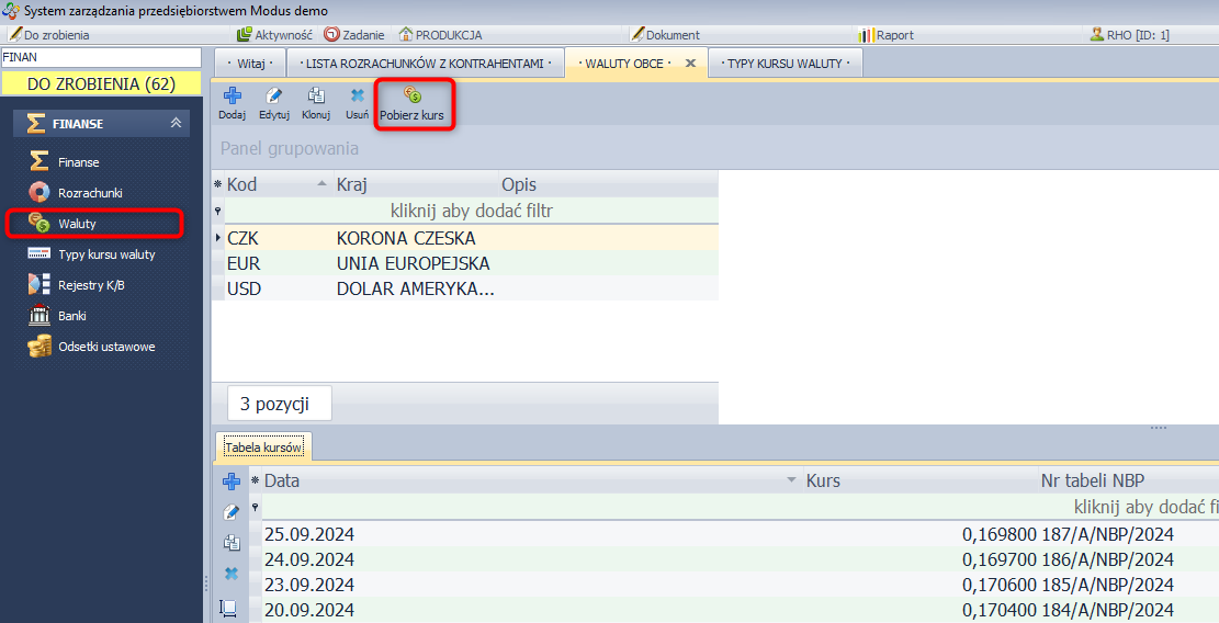 Istnieje możliwości definiowania aktualnego kursu walut.