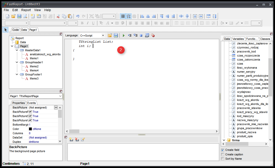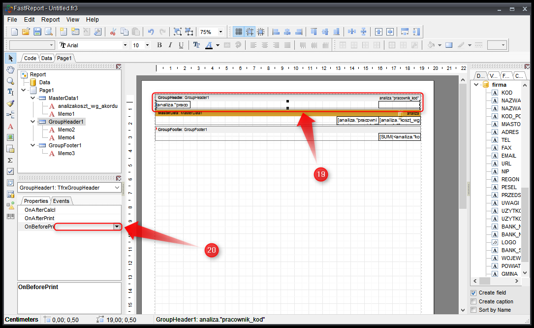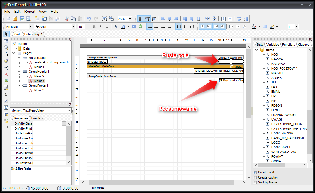- Tworzymy szablon wydruku ze wstęgami GroupHeader oraz GroupFooter