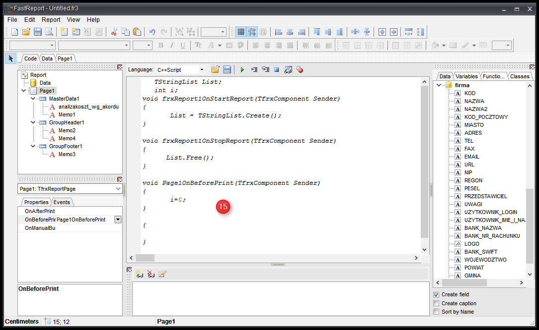 - Klikamy GroupHeader1 → Events