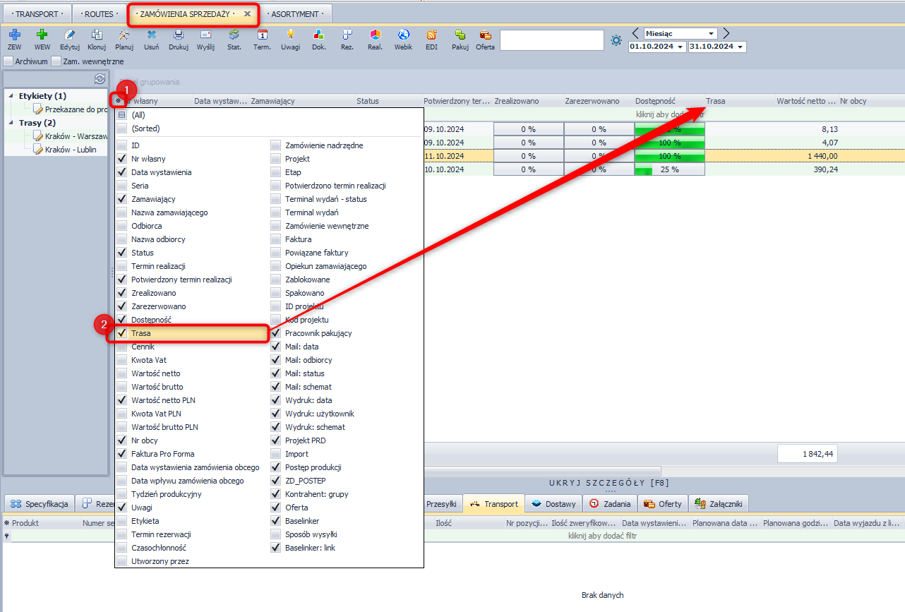 W celu ułatwienia planowania produkcji oraz planowania transportu w oparciu o trasę należy włączyć kolumnę trasa i w filtrze wybrać odpowiednią trasę.