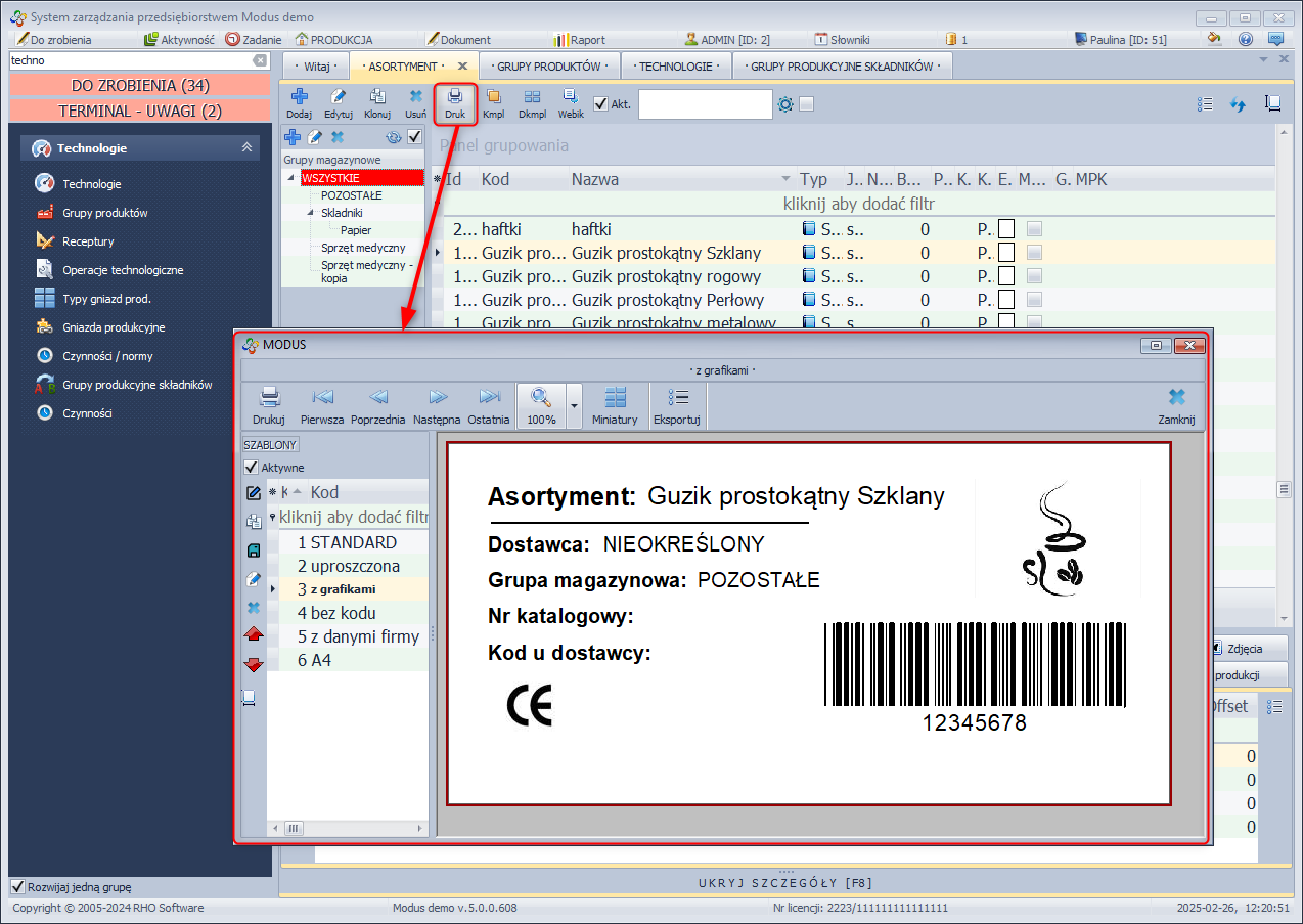 Ikona służy do wydruku etykiety asortymentu. Wydruk jest realizowany według zdefiniowanego szablonu, który można edytować. Informacje, w jaki sposób edytować bądź stworzyć nowy szablon, znajdziesz tutaj.