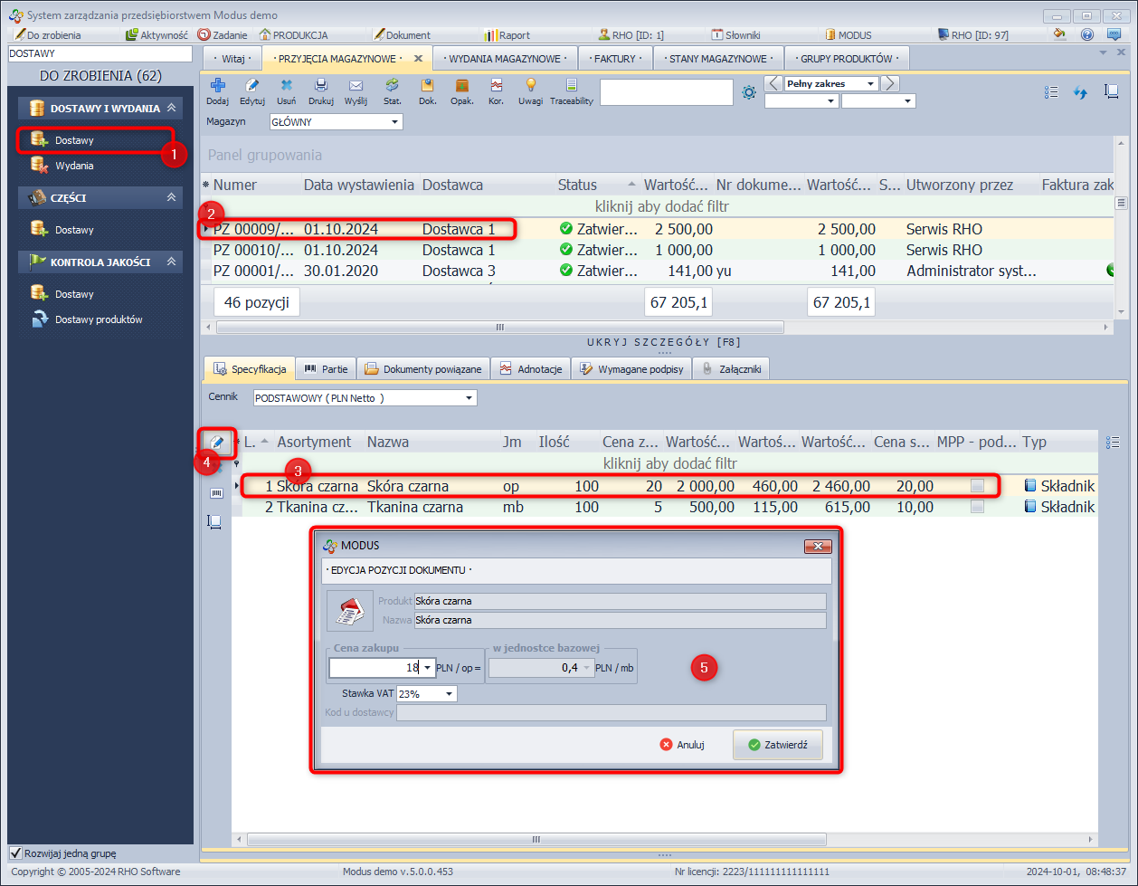 - Zaznacz dokument dostawy, na którym znajduje się partia sortymentu, której cenę chcesz edytować.