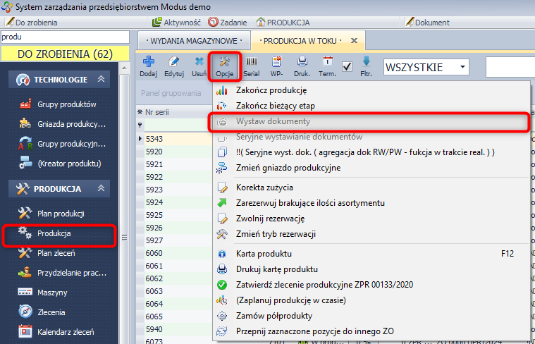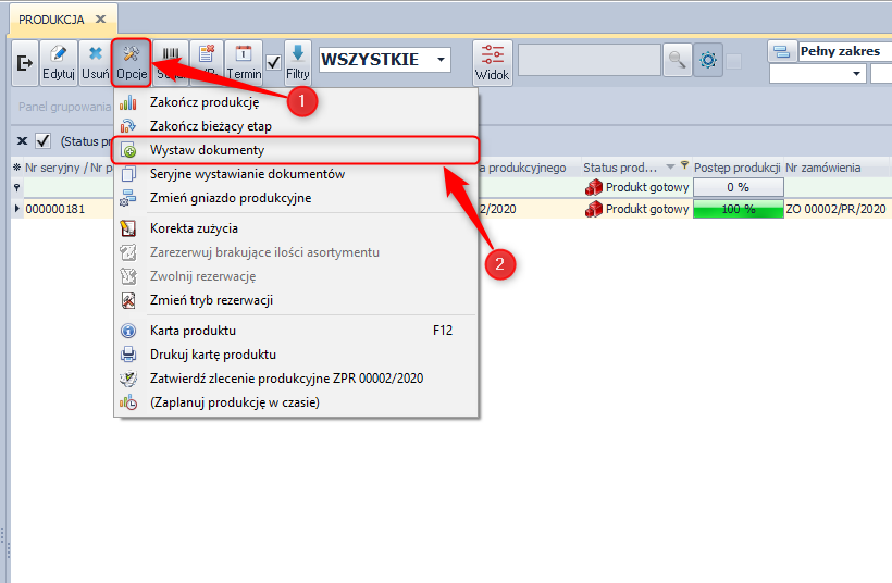 Jeśli opcja nie zostanie zaznaczona, klikając w module PRODUKCJA / Produkcja w ikonę - Wystaw dokumenty, można ręcznie wystawić dokument PW dla zakończonej produkcji.