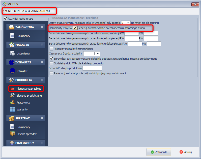 Dokumenty PW tworzone są także po zakończeniu produkcji. Generowane mogą być ręcznie lub automatycznie w zależności od konfiguracji programu (opcja „Dokumenty PW/RW Generuj automatycznie po zakończeniu ostatniego etapu”).