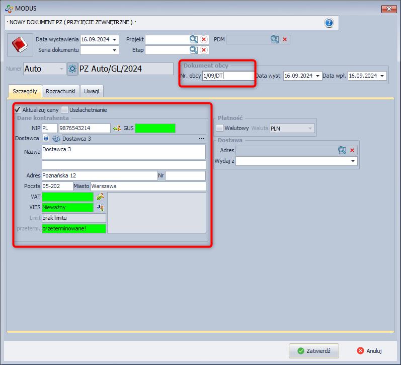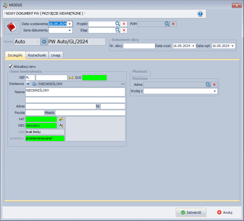 - Spowoduje to otworzenie okna Nowy dokument PZ, w którym uzupełnij dane.