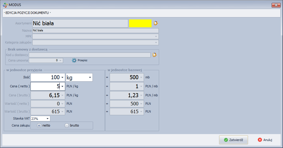 Edycja ceny zakupu/stawki VAT