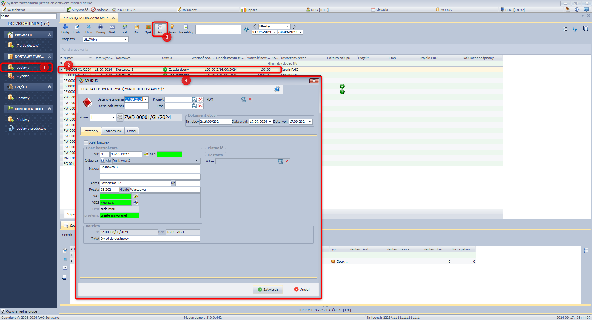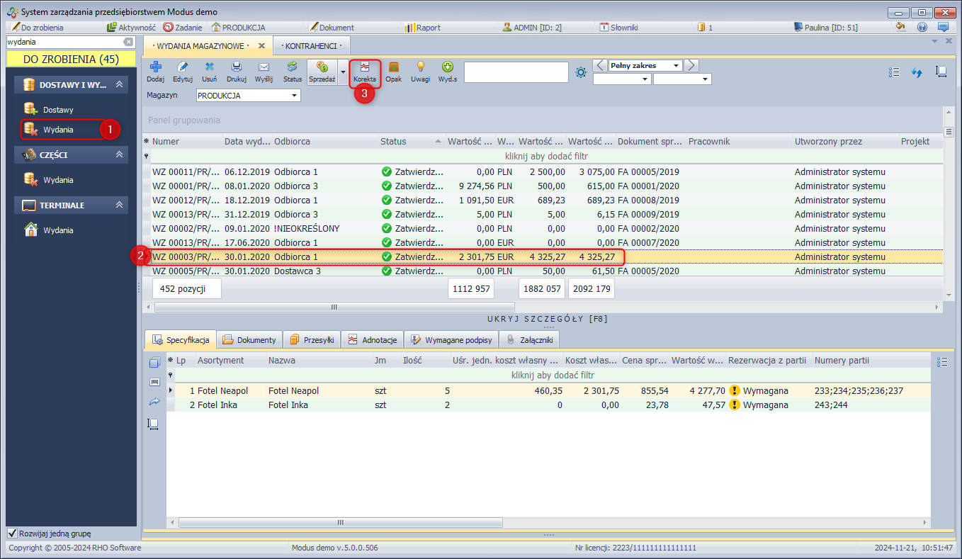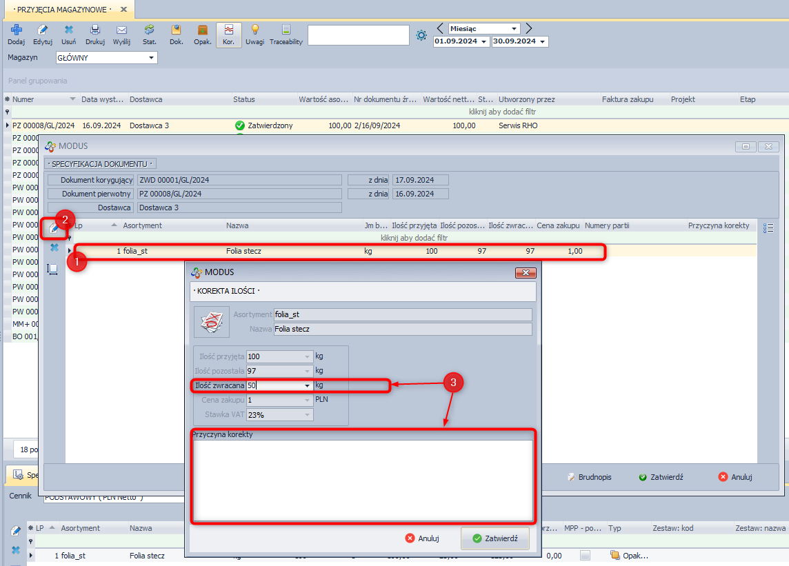 System MODUS umożliwia dokonanie korekty dokumentu, którego status nie pozwala na jego edycję.