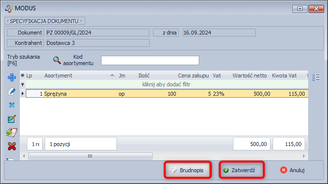 - Zapisz i zatwierdź dokument - ta opcja zatwierdzi automatycznie dokument, nie będzie już możliwości wprowadzenia zmian w specyfikacji dokumentu PZ.