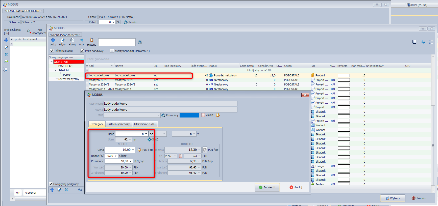 - W zakładce specyfikacja zaznacz partię asortymentu, której cenę chcesz edytować.